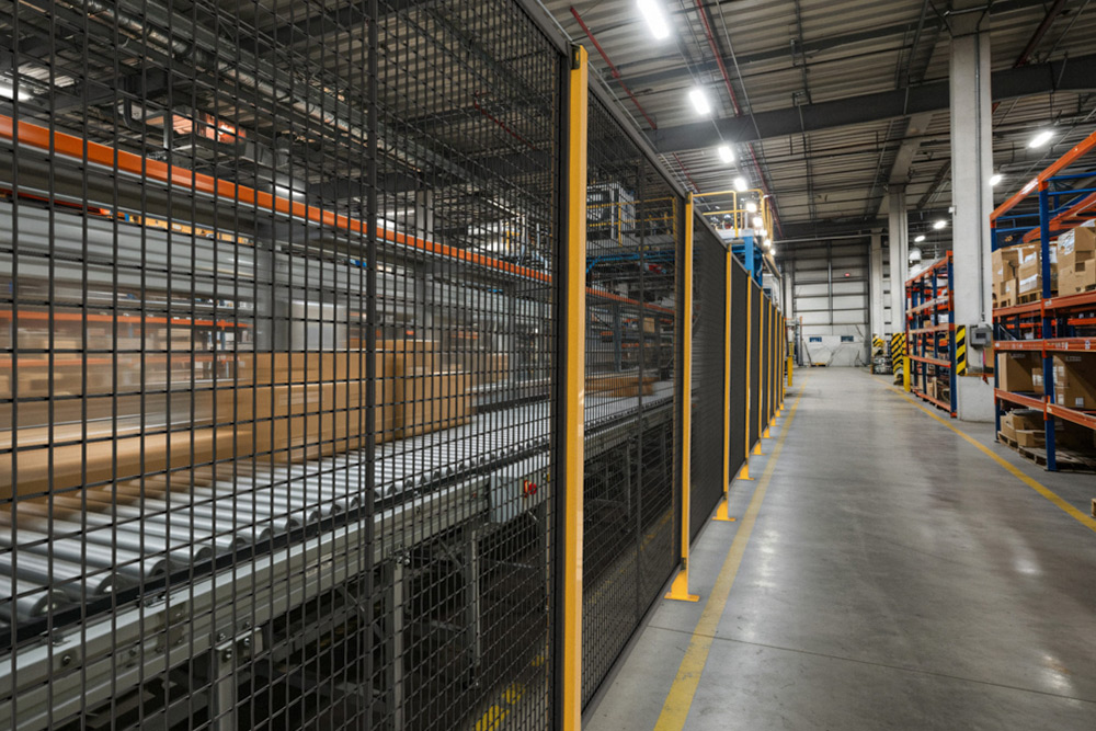 Mesh and solid panel options for machine separation and perimeter protection.
